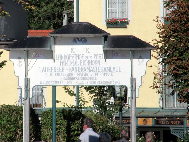 Historische Inschrift vom Landgasthof zur Post am Bootslandesteg von Weyregg am Attersee, Erinnerung an die Existenz des einstigen K.u.K. Yachtgeschwaders am Attersee.