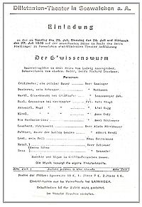 Mit der Anzengruber-Tragödie „Der G`wissenswurm“ begann der Spielbetrieb, zu dem der in dieser Zeit oft in Seewalchen auf Urlaub weilende akademische Maler Prof. Richard Teschner, die großen Hintergründe und Kulissen malte. Vor der Bühne, in einem eigens für die Musik gebauten Orchestergraben, spielte unter der Leitung des Bäckermeisters Karl Andorfer, das theatereigene Streichorchester vor den Aufführungen und in den Pausen.