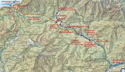 Auf dieser Karte siehst du den Weg des Hallholzes von Weißenbach am Attersee durch das Weißenbachtal bis zur Traun. Wie du schon erfahren hast, wurde zuerst das Hallholz mit Holzfuhrwerken von Weißenbach in der Gemeinde Steinbach am Attersee bis zum Hallholz-Aufzug gebracht (hier orange eingezeichnet) und mit diesem zu einer künstlich angelegten Wasserriese hochgefördert. Ab diesem Punkt schwamm das Holz über die 6 km lange Riese (hier blau eingezeichnet), überwand dabei die Wasserscheide zwischen dem Attersee und dem Traunsee, bevor es im Mitterweißenbach landete und bis zur Traun triftete. Auf der Traun ging die Reise dann bis zur Saline in Ebensee weiter.