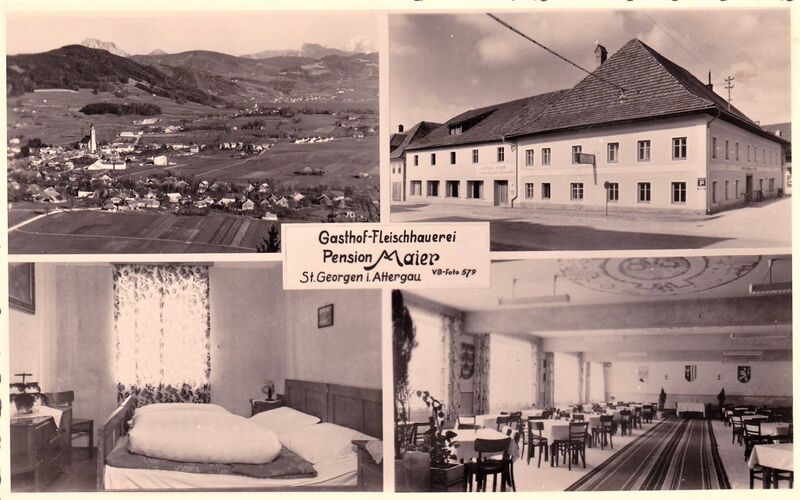 Bildtitel: Gasthof und Fleischhauerei Maier um 1960 in St. Georgen im Attergau