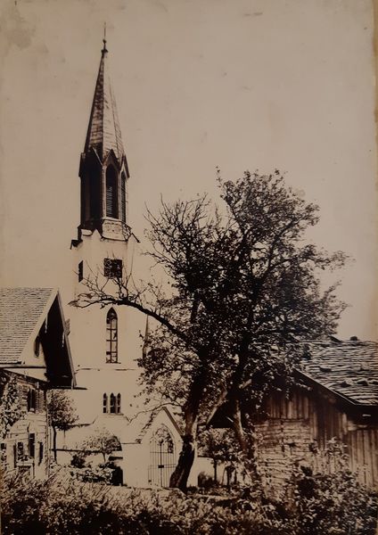Bildtitel: Evangelische Kirche Attersee mit Küsterhaus (Fromingerhaus) links und Fischerhaus (jetzt Gemeindezentrum) rechts