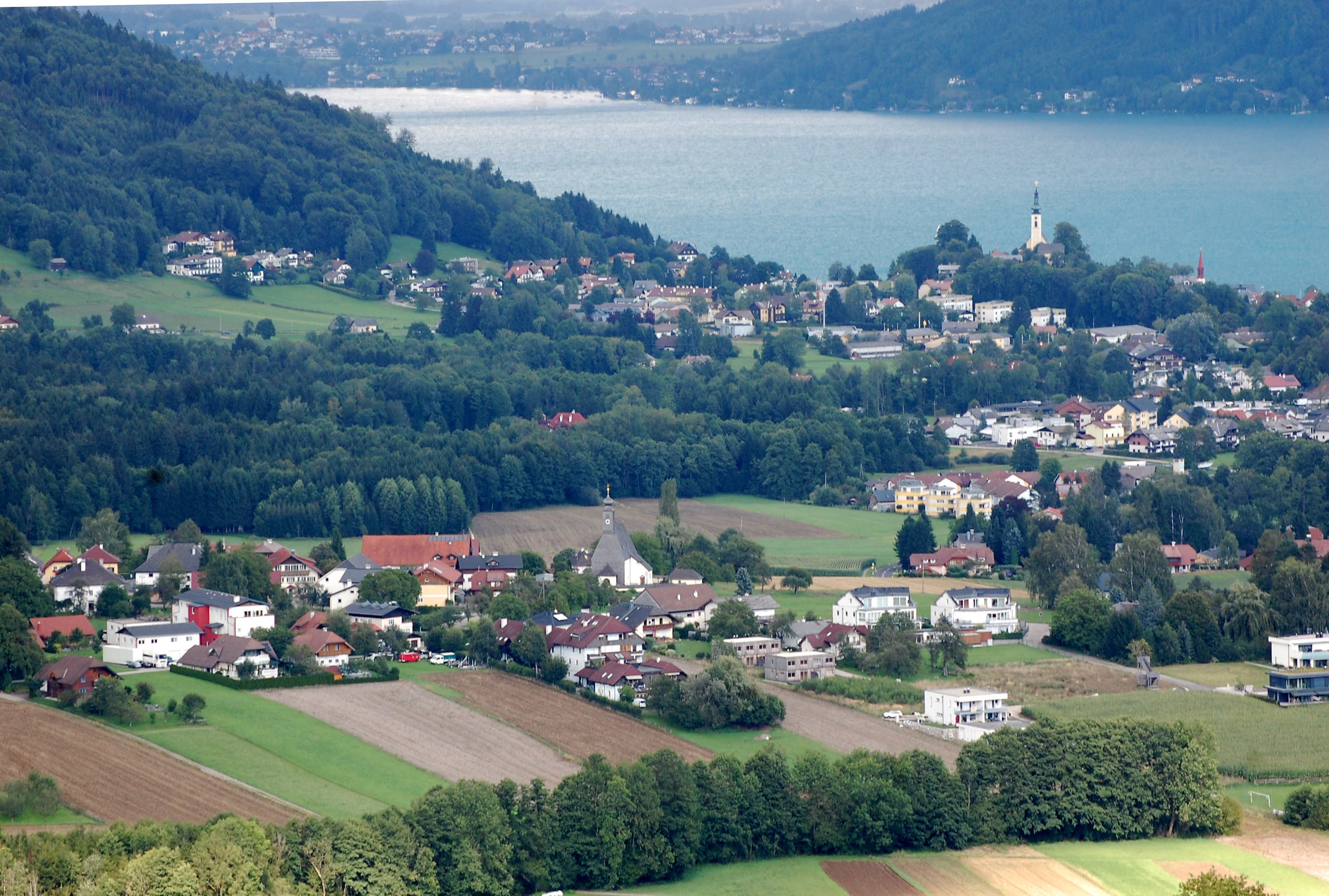 Datei:Pfarrkirche Abtsdorf (Vordergrund Mitte) , rechts Pfarrkirche Attersee.jpg