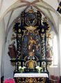 Auf dem mächtigen Hochaltar aus den Jahren 1699-1701 stehen im Mittelstück in Lebensgröße der Kirchenpatron St. Laurentius, flankiert von den Statuen des hl. Wolfgang und hl. Nikolaus. Die genannte Gruppierung der Statuen wird von einer Dreifaltigkeit-Darstellung gekrönt.