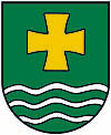 Auf grünem Grund schwebt über 3 silbernen Wellen ein goldenes Tatzenkreuz.