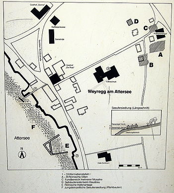 Auf dem Gemeindegebiet von Weyregg am Attersee sind zwei außerordentliche Befunde zu lokalisieren. Eine Villenanlage, die aus mehreren Gebäuden bestand, und die 300 m entfernt liegende römische Anlage im See. Beide Anlagen stehen unter Denkmalschutz. Es wird angenommen, dass beide Anlagen zusammengehört haben.