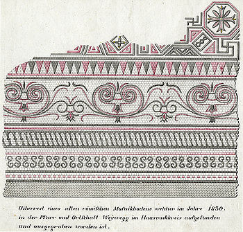 • 1842-1843 Bei Straßenarbeiten an der Straße nach Weißenbach wurden ebenfalls Mosaikteile ergraben. Die Fundstelle (Gebäude B) befand sich neben der Wandelhalle. 1843 wurde das Mosaik (Oktogonmuster) von G. Weißhäupl gezeichnet und der Befund geborgen. 1843 wurde von G. Weißhäupl ein weiteres Bodenmosaik in Schachbrettmuster mit Efeubordüre entfernt.