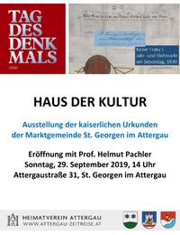 Der Heimatverein Attergau lädt zum Tag des Denkmals am Sonntag, den 29. September 2019, von 14 bis 17 Uhr in das Haus der Kultur in St. Georgen im Attergau, Attergaustraße 31, ein. Freier Eintritt, freiwillige Spenden.