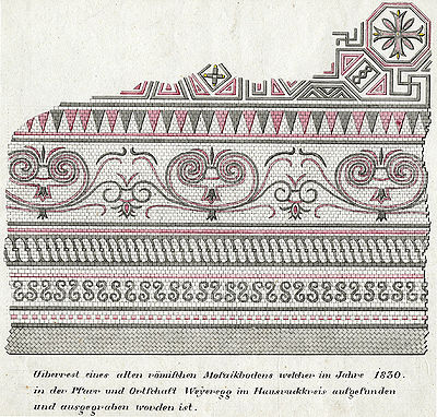 - 1842-1843 Bei Straßenarbeiten an der Straße nach Weißenbach wurden ebenfalls Mosaikteile ergraben. Die Fundstelle (Gebäude B) befand sich neben der Wandelhalle. 1843 wurde das Mosaik (Oktogonmuster) von G. Weißhäupl gezeichnet und der Befund geborgen. 1843 wurde von G. Weißhäupl ein weiteres Bodenmosaik in Schachbrettmuster mit Efeubordüre entfernt.